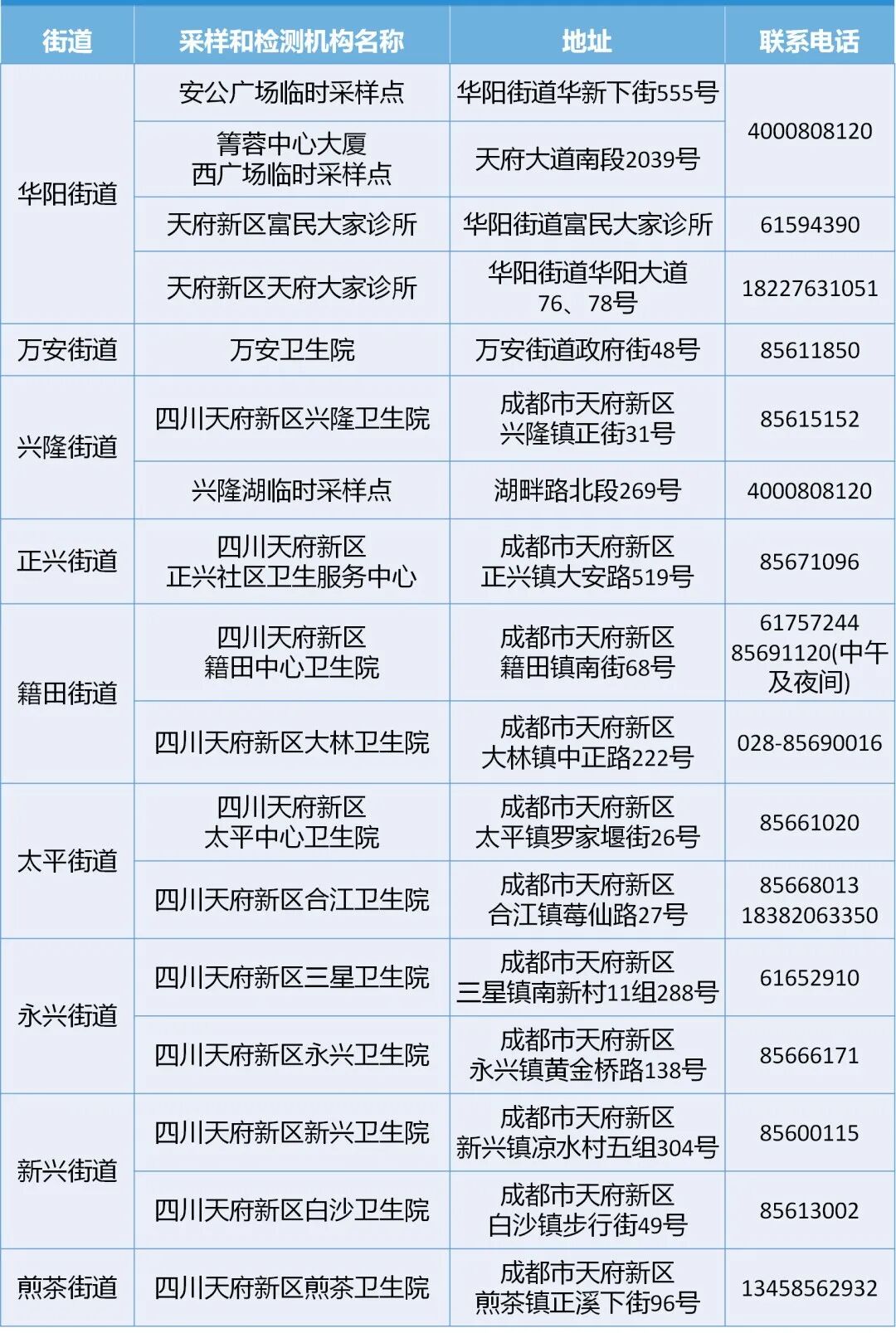 四川天府新区成都直管区自愿检测人群核酸采样点位信息表