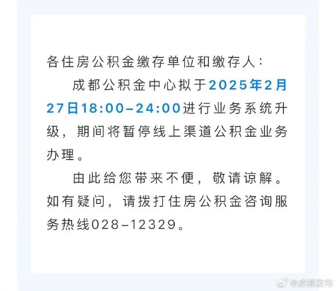 需要办理线上业务的小伙伴注意!成都公积金中心拟于2025年2月27日(今日)18:00-24:00进行业务系统升级,期间将暂停线上渠道公积金业务办理。如有疑问,可拨打住房公积金咨询服务热线028-12329。(成都发布)