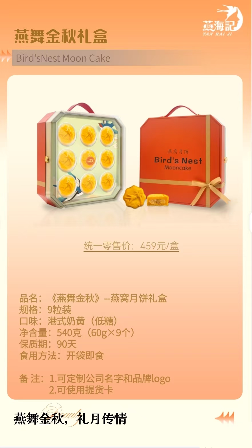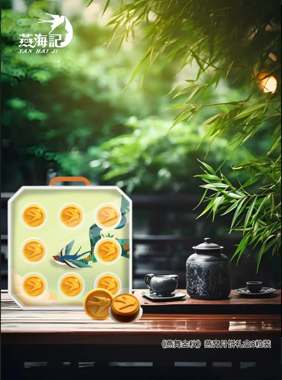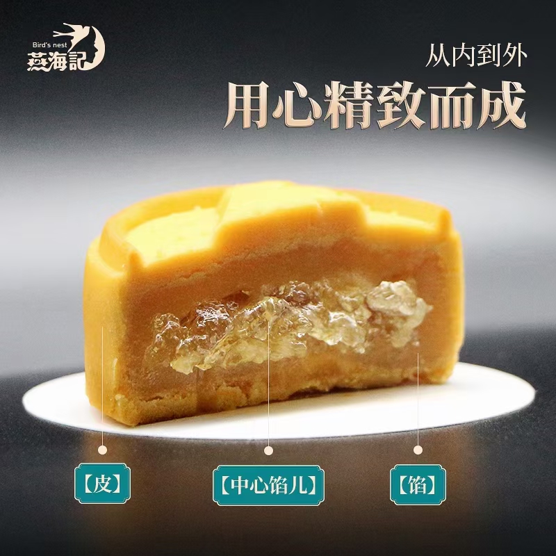 燕窝与传统月饼相融合,打造时尚月饼新概念升级新配比,燕窝馅料更足。经典皮料,丰富口味,让你美味不停口;