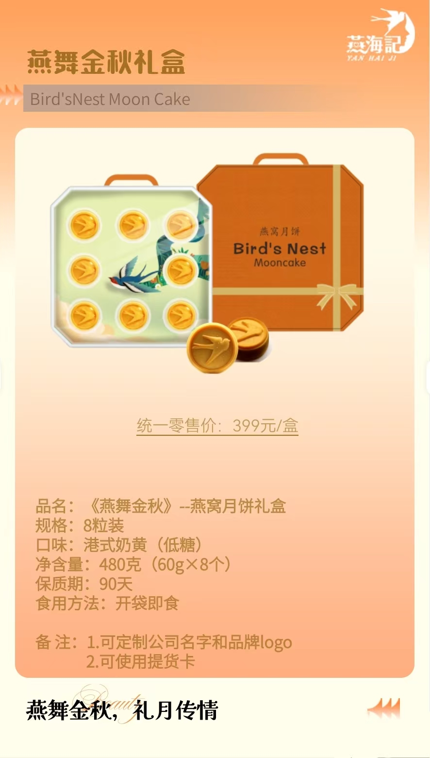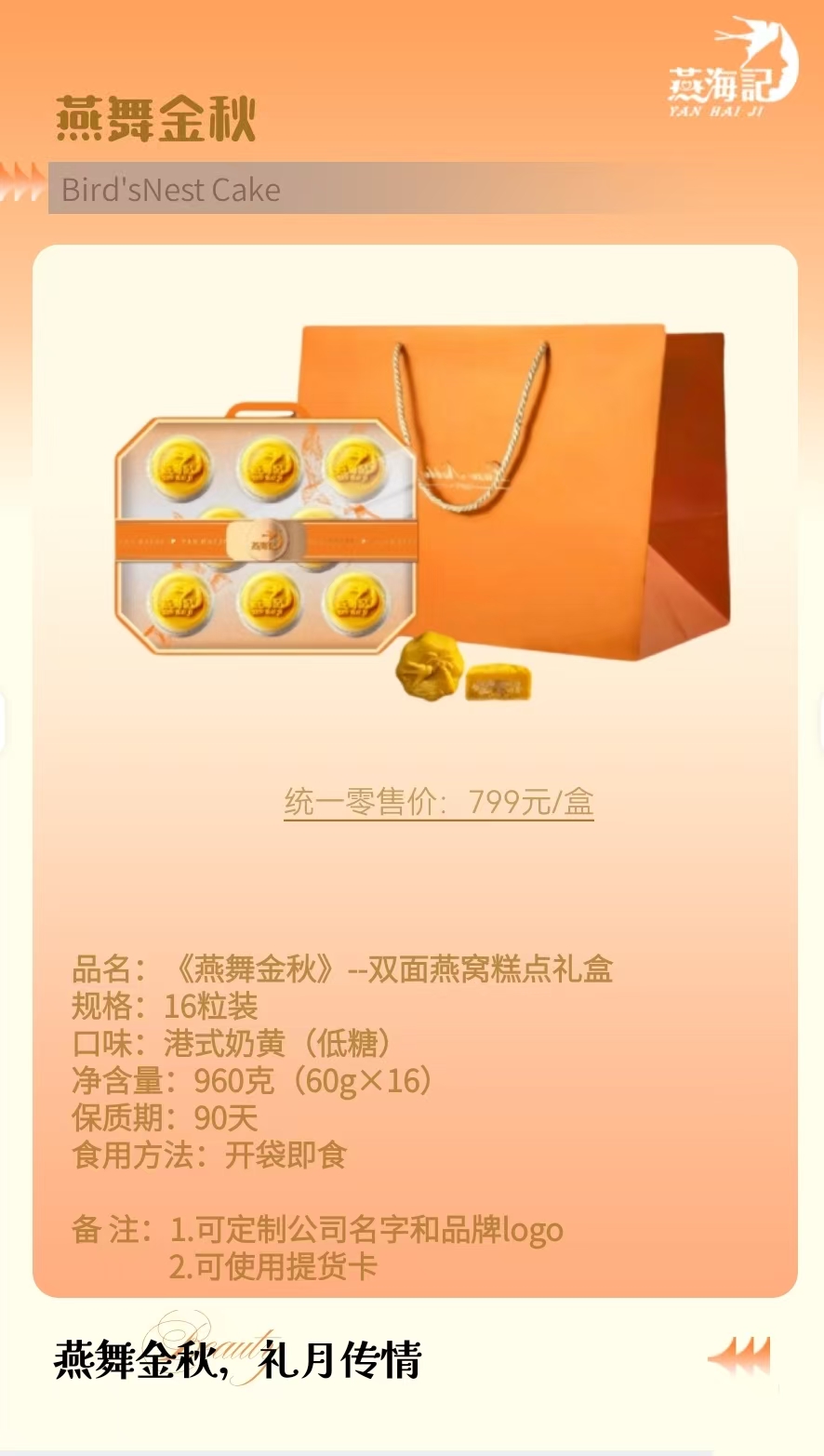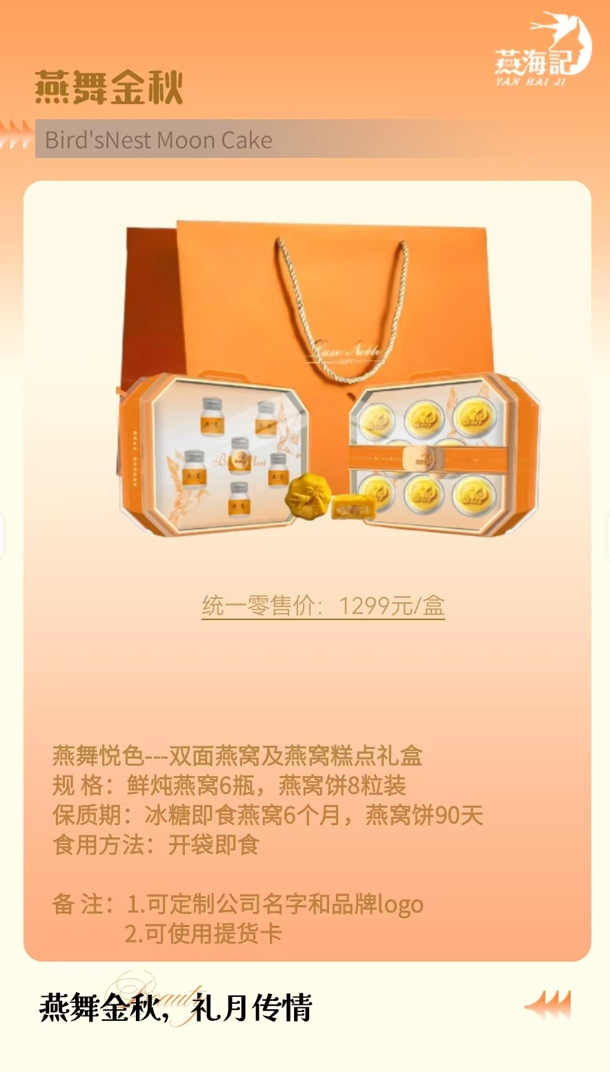 聘请专业设计师精心设计,独一无二由五粮液等知名品牌包装厂生产制作,搭配燕海记燕窝月饼,一场中秋,雅致怡然,携份好礼,品一份浓情,让燕窝月饼成为传递情谊的最佳选择