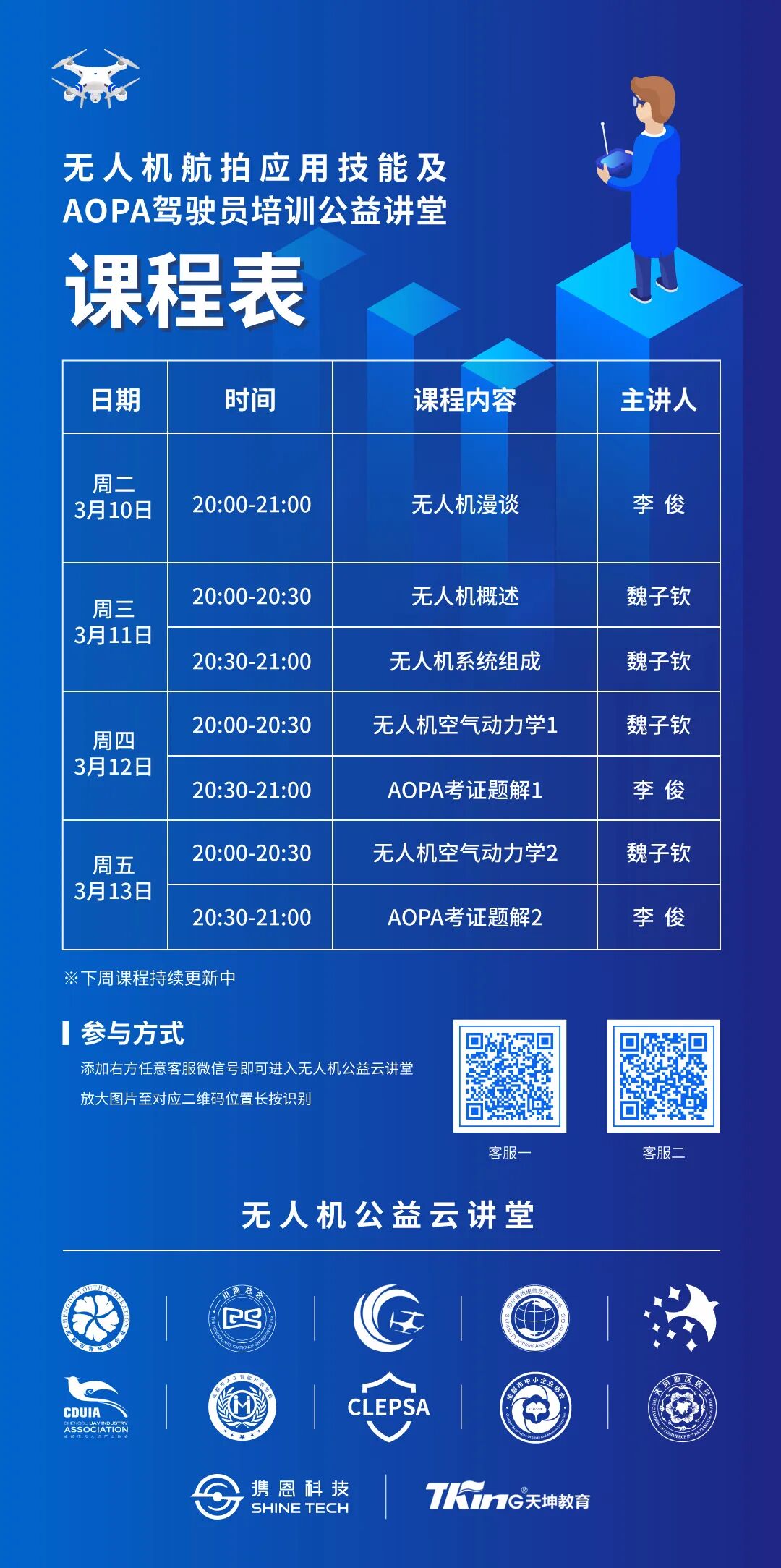 在3月10日-4月15日期间,我们将持续整理无人机相关知识、AOPA考证培训、航拍技能分享等学习资源,面向全国开放,免费为大家提供课程分享。文末是本周直播课程表,请查收!今晚20:00,我们将为大家带来无人机概述和无人机系统组成内容分享。请对无人机公益云讲堂感兴趣的朋友扫描下方二维码/搜索微信ID添加任意客服微信,第一时间邀您进群,即可参与无人机公益云讲堂,群内更有在线直播、在线答疑、资讯分享、考题详解等多重福利!